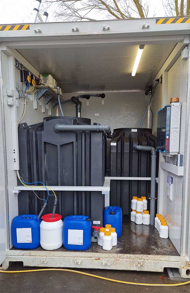 Idealnym rozwiązaniem dla tego projektu był proces ClearFox® FBBR do biologicznego oczyszczania ścieków jako system kompaktowy. 20-stopowy kontener morski zawiera zbiornik buforowy, proces FBBR, separator lamelowy i stacje dozujące.